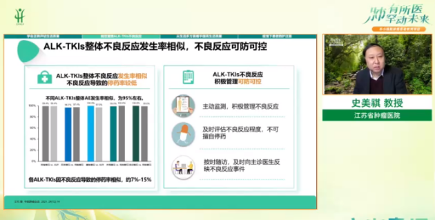 谈及如何规范管理ALK-TKIs的不良反应,史美祺教授在直播中讲道,ALK-TKIs整体不良反应发生率相似,不良反应导致的停药率较低,且不良反应可防可控。史美祺教授同时也指出,要从营养支持、心理干预、积极进行运动、按时随访多个方面着手以提高生活质量。