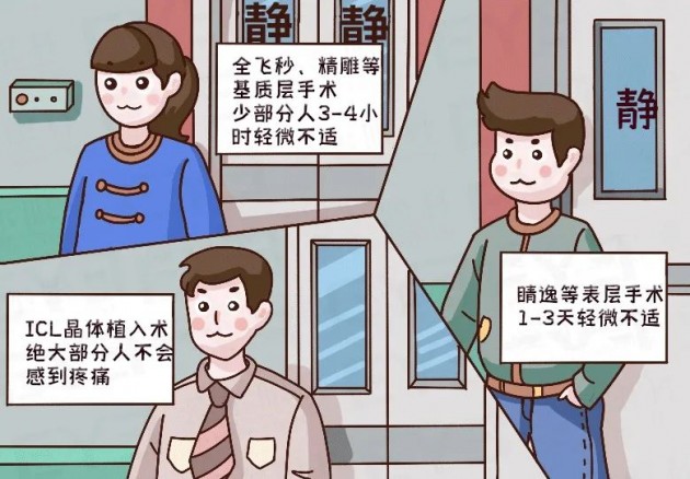 做激光手术,激光扫描时,部分人会轻微感觉到负压的存在;取透镜时部分患者可能有轻微的压迫感、牵拉感。整个手术过程中,不会有明显的痛感。如果是做晶体植入类手术,植入晶体过程中患者会有一些酸胀感,但基本没有明显的痛感,对于个别敏感的人来说,也是稍微有些不适。手术完成后,部分近视患者术后可能会有点害怕,不敢睁眼,但其实一般来说,激光类近视手术术后即可睁眼,第二天复查无异常就不影响正常生活。