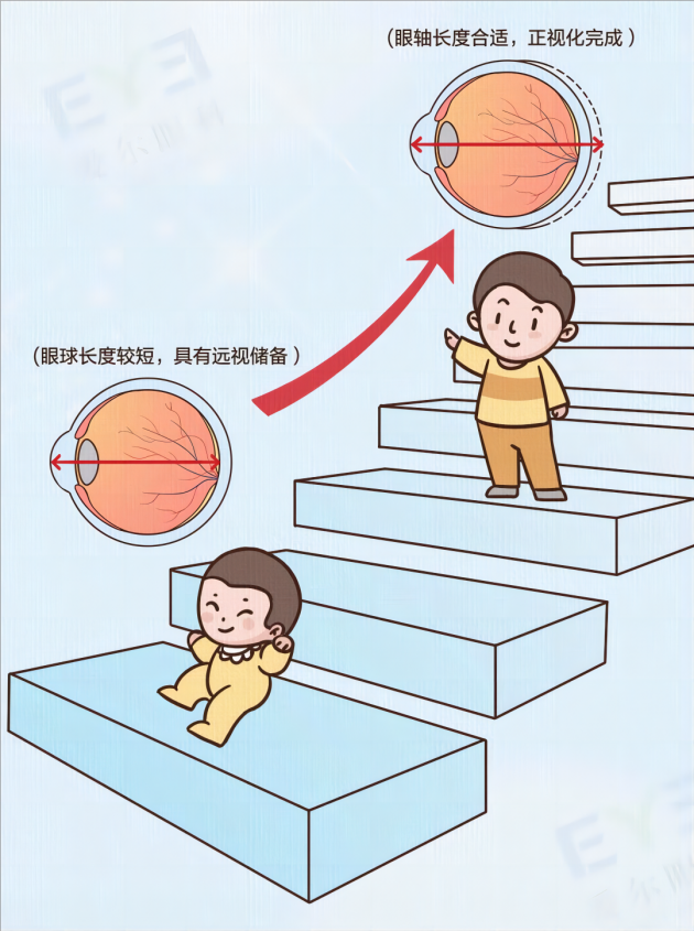 眼轴,就是眼球的前后径的长度。一般情况下,新生儿的眼球相对较短,处于远视状态(一般为远视250-300度),这种生理性远视称为远视储备。随着生长发育,儿童青少年眼轴增长,远视度数逐渐降低,一般到15岁左右发育为正视眼,这个过程称为正视化。